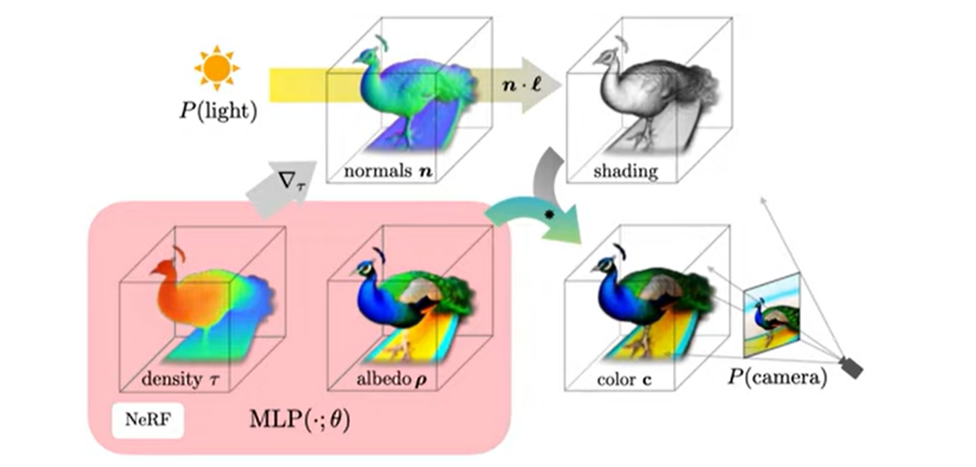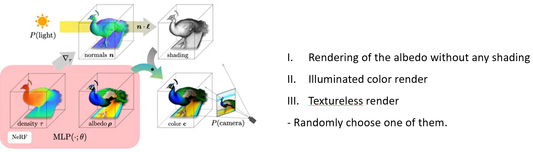 NeRF에서 이미지를 rendering하는 것은 카메라의 중심에서 이미지 픽셀 위치로 쏘는 ray를 casting하여 수행된다. 각 ray를 따라 sampling된 3D point들은 MLP를 통과하여 density와 RGB를 출력하고, density와 color를 카메라 방향으로 alpha compositing하여 최종 rendering을 하게 된다. 또한 이전 연구에서 density의 음의 기울기를 normalize 하면 object의 normal 정보를 얻을 수 있다 했는데, 이 normal 정보와 light position, albedo를 diffuse reflectance () 를 이용해서 shading 또한 할 수 있다. 마지막으로 random하게 특적 albedo를 white로 바꿔서 textureless shading도 진행할 수 있고, 위 세 가지 방법 중 하나를 random하게 선택해서 학습을 진행한다.