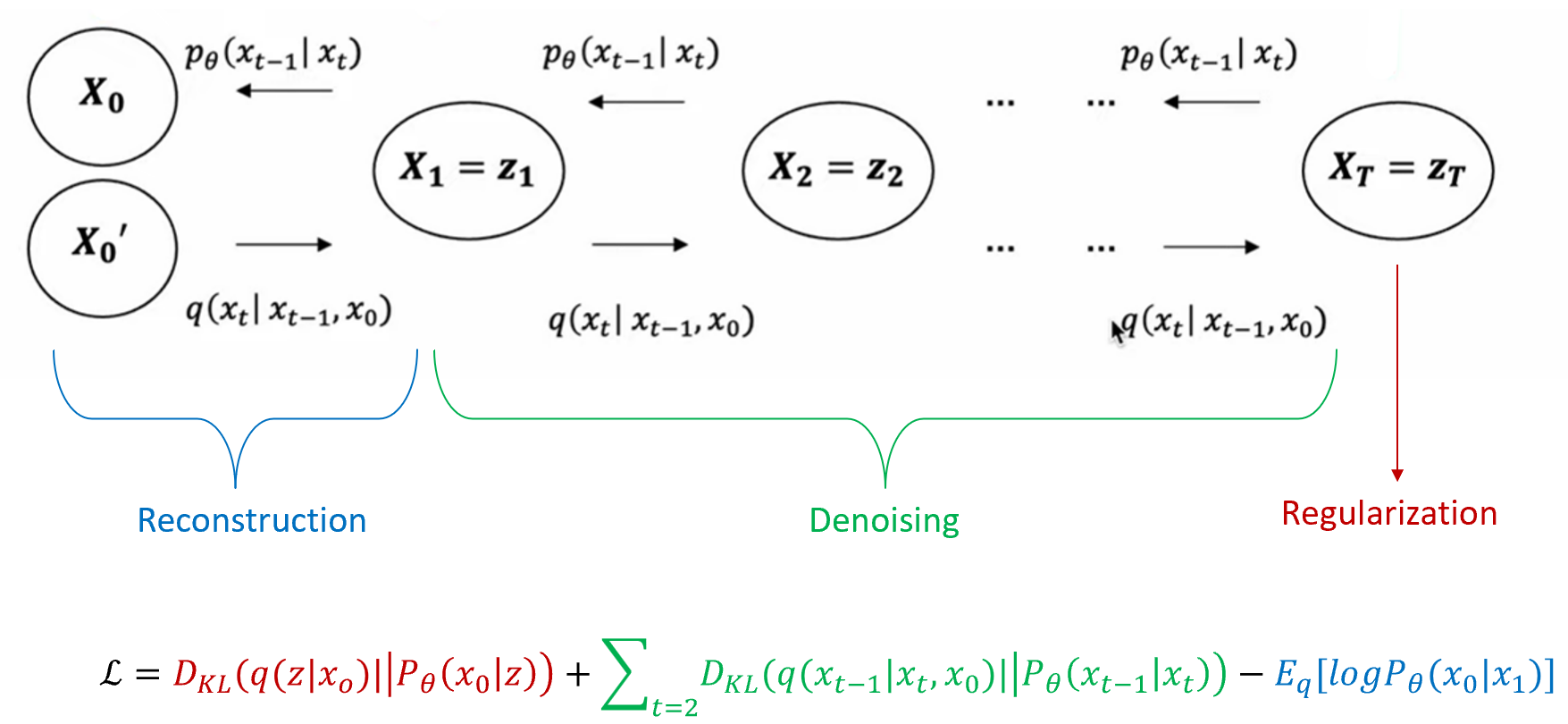 reconstruction loss는 원래의 이미지와 최종적으로 denoising되어 reconstruction된 이미지의 분포 차이를, denoising loss는 각 timestep 마다 noise가 추가된 이미지와 noise가 제거된 이미지의 분포 차이를, regularization term은 최종적으로 noise가 추가된 이미지에서의 Gaussian 분포와 standard Gaussian 분포의 차이를 비교한다.