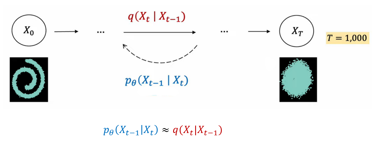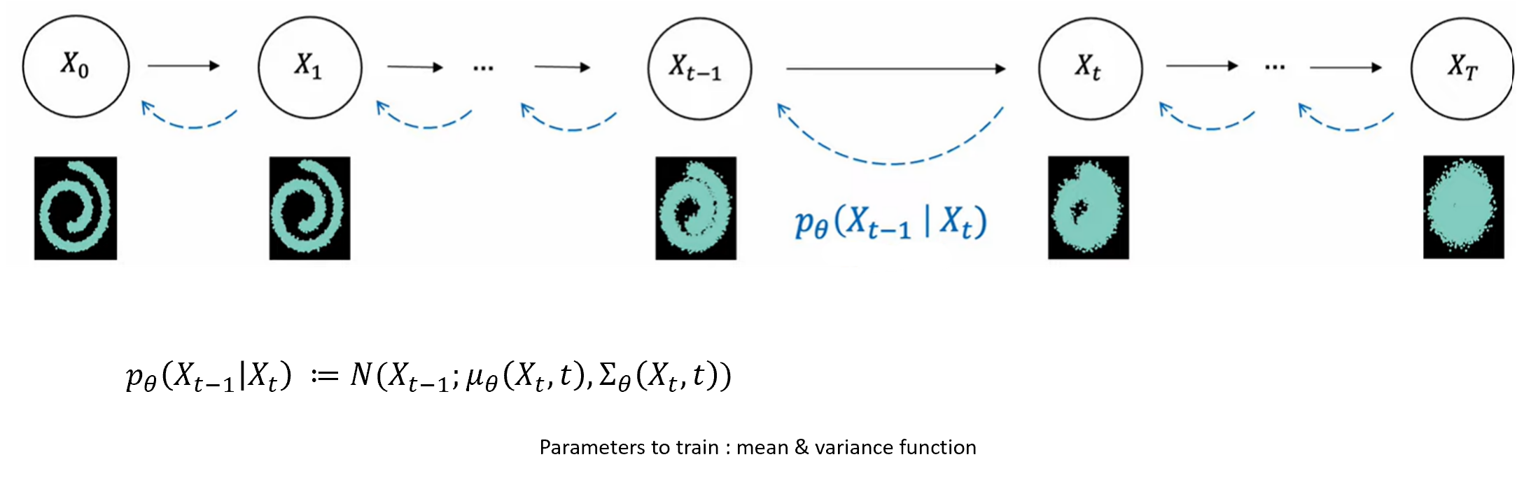 Forward process는 조건부 Gaussian 분포로 산저했고, reverse process 또한 Gaussian 분포가 된다. 차이는 forward process는 사전에 정의된 의 크기에 의해 평균과 분포가 정의되었고, reverse process는 우리가 알지 못하는 Gaussian 분포이다. 즉, 이 평균과 분산을 학습을 통해 알아내야 한다.