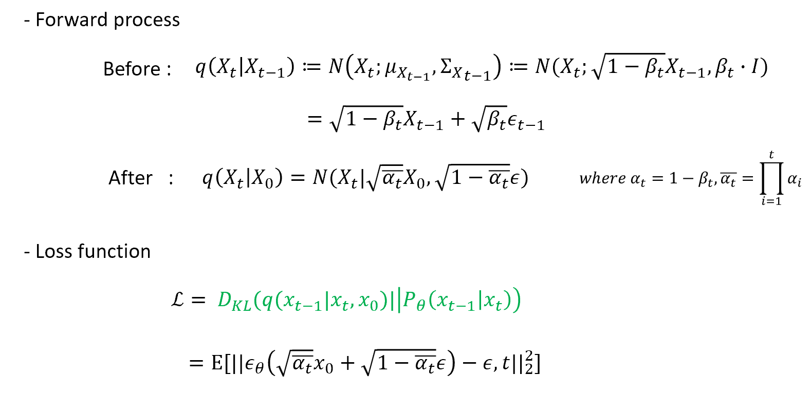 DDPM에서 이전과 살짝 다른 부분이 있어서 짚고 넘어가보겠다. 기존 Diffusion model은 각 timestep마다 noise를 추가해가면서 서서히 Gaussian 분포로 바꿔나갔다. 하지만 이 과정을 1000번 수행하는건 상당히 비효율적이다. DDPM은 forward process를 한번에 수행해내는 수식을 발견한다. Loss function에서는 기존에 있던 regularization, reconstruction loss term을 배제하고 denoising loss term만 사용한다. 기존 Diffusion model과 다르게 에서 시점으로 계산을 할 수 있으므로, 즉 정답 분포의 평균과 분산을 알고 있으므로 noise만 예측하면 되는 꼴로 바뀌게 된다.