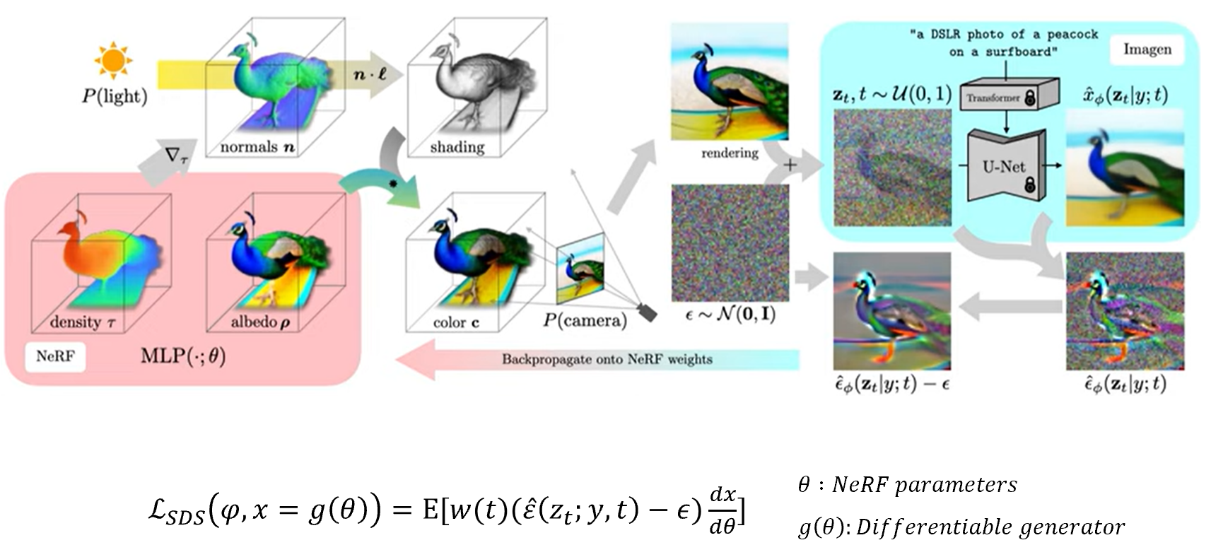 주어진 과정들을 이용해서 렌더링된 이미지와 특정 timestep이 있을 때, 여기서 noise를 sampling하여 loss 값을 구하고, 이를 통해 NeRF의 파라미터를 업데이트한다.