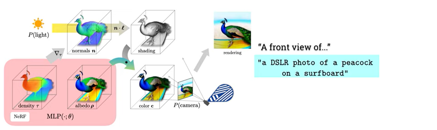 DreamFusion은 scene을 Neural Radiance Field (NeRF) 를 이용해서 표현한다. NeRF는 MLP를 통해 density와 color를 파라미터화한다.