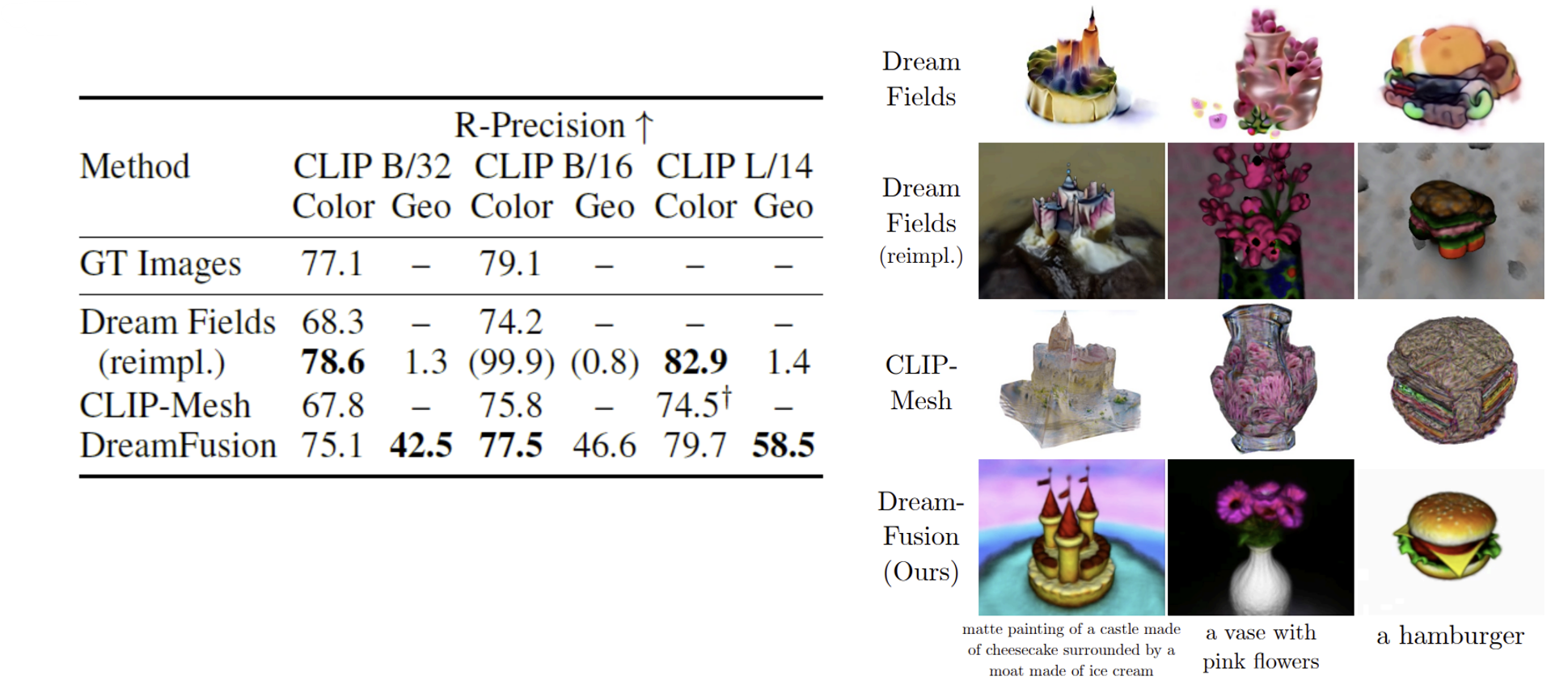 평가지표로는 입력 문자에 대한 렌더링된 이미지의 일관성을 측정하는 CLIP R-precision으로 평가했다고 한다. View synthesis 분야에서는 rendering된 view와 ground-truth를 비교하기 위해 PSNR을 사용하지만, ground-truth가 없으므로 사용할 수가 없다. R-precision은 ClIP rendering된 scene에서 올바를 caption을 가져올 때의 정확도이다.