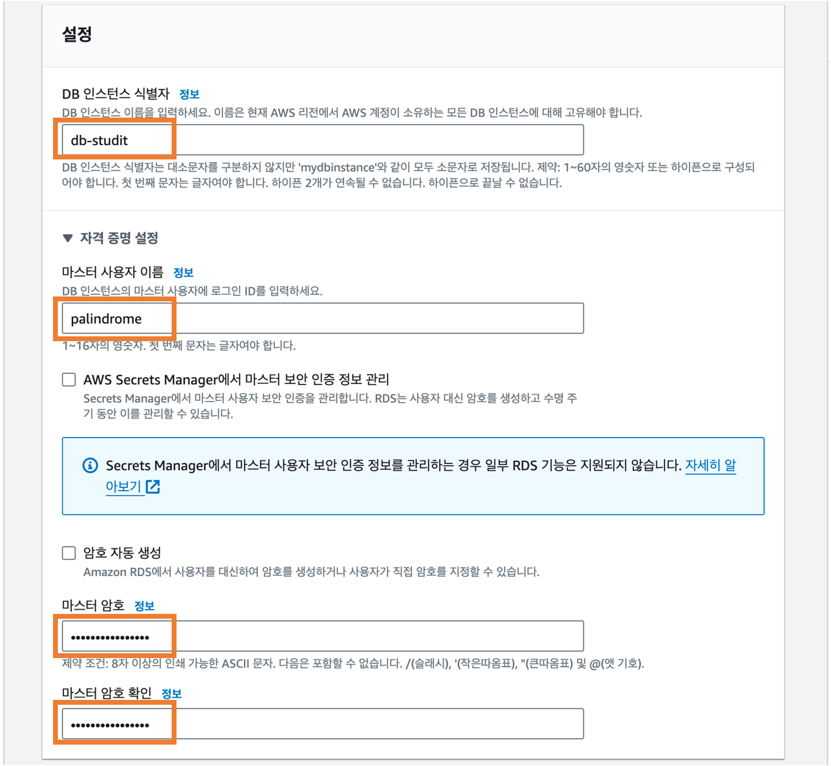 - 마스터 사용자 이름, 마스터 암호, 마스터 암호 확인