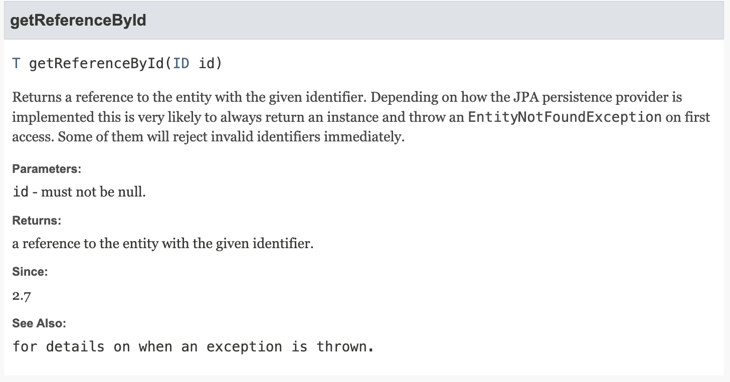 문서와는 다르게 EntityNotFoundException이 없다. 반환하는 부분을 보면, entityManager.getReference 메서드에 의해 간접적으로 발생하는 것을 알 수 있다.
