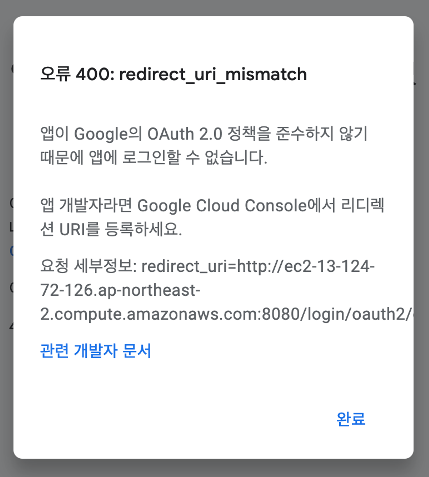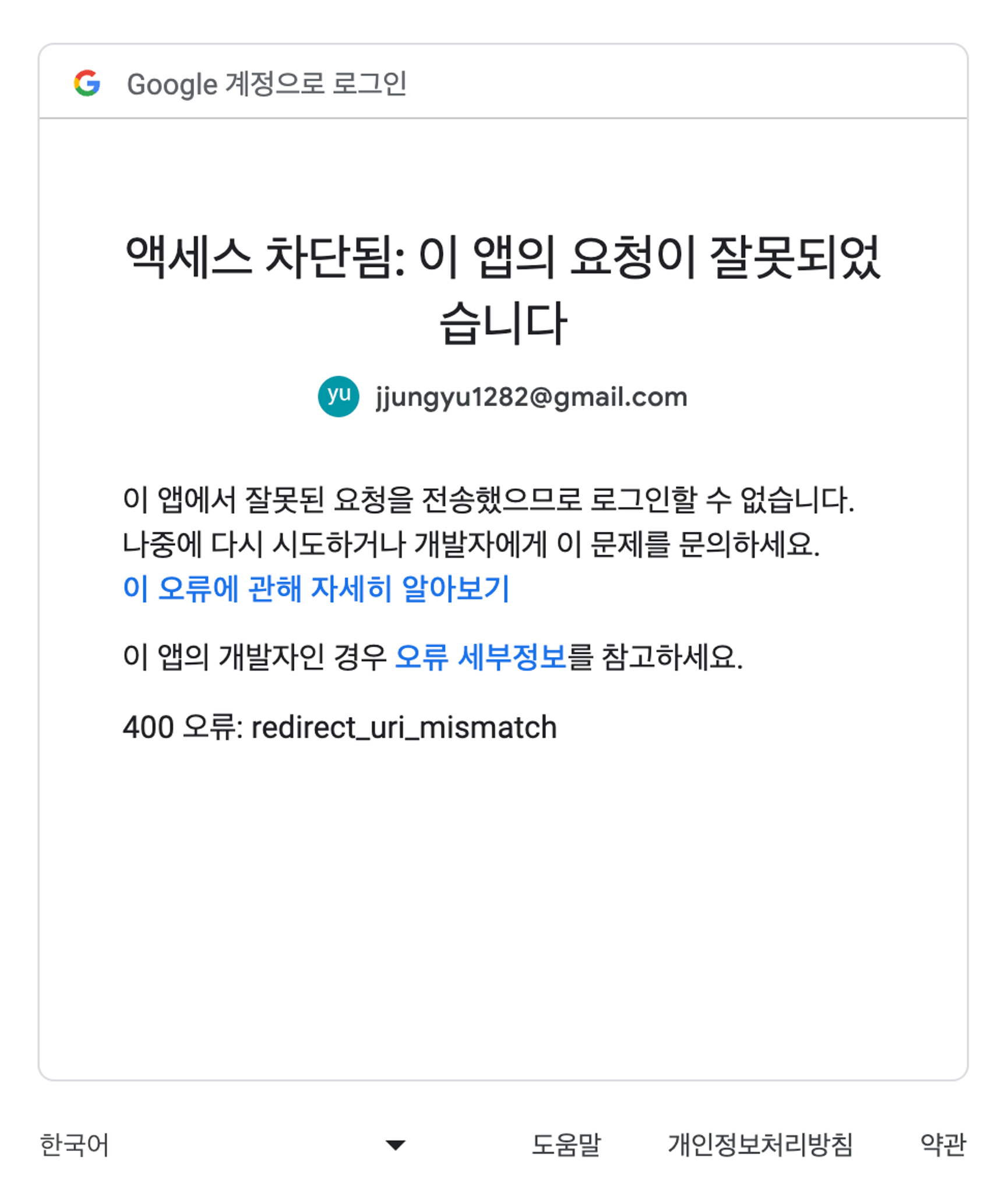 그래서 구글 OAuth2 리디렉션 주소를 변경해주고 구글 로그인을 시도하니까 400 오류: redirect_uri_mismatch 오류가 발생했다.