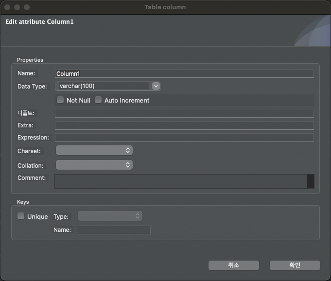 만든 Table화면에서 오른쪽 마우스를 눌러 Create New Column을 클릭 하면 다음과 같은 화면이 뜬다.