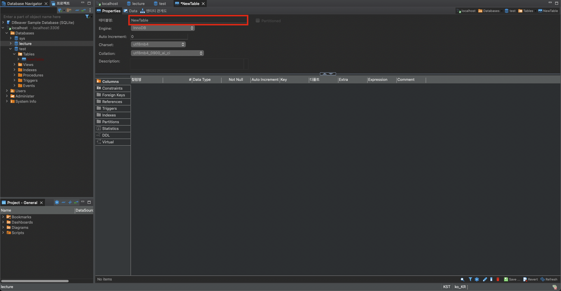 그럼 위 화면에서 보이는 것과 같이 생성한 Table에 이름을 지정해주면 된다.