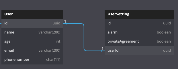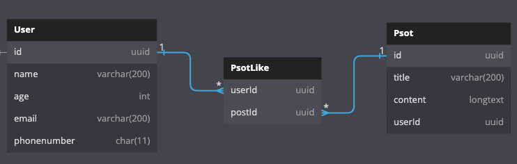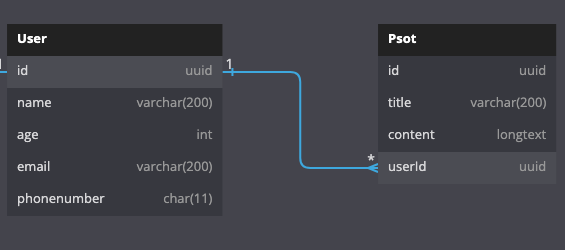 일대일 관계이다. 예를 들어보자 만약 헬스장에서 회원을 등록을 한다. 회원 정보는 User라는 테이블에 저장이 되고 사용자는 락커를 등록한다고 한다. 그럼 락커정보는 Post 테이블에 저장한다.