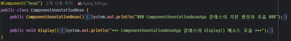 위에 보면 @Componebt 어노테이션을 쓴 것을 볼 수 있다. 해당 어노테이션을 사용하기 전에 xml(Spring Container) 환경설정파일에 설정을 해줘야한다.