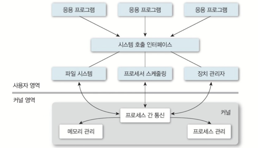 커널이 점점 커지니까 문제가 생겨서, 커널에는 진짜 필수적인 요소만 넣고 나머지는 사용자 영역에서 응용 프로그램처럼 실행을 하자