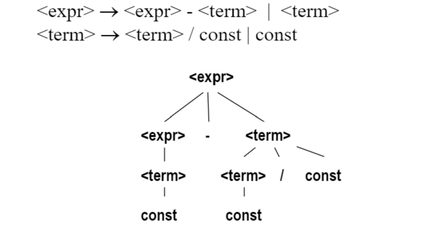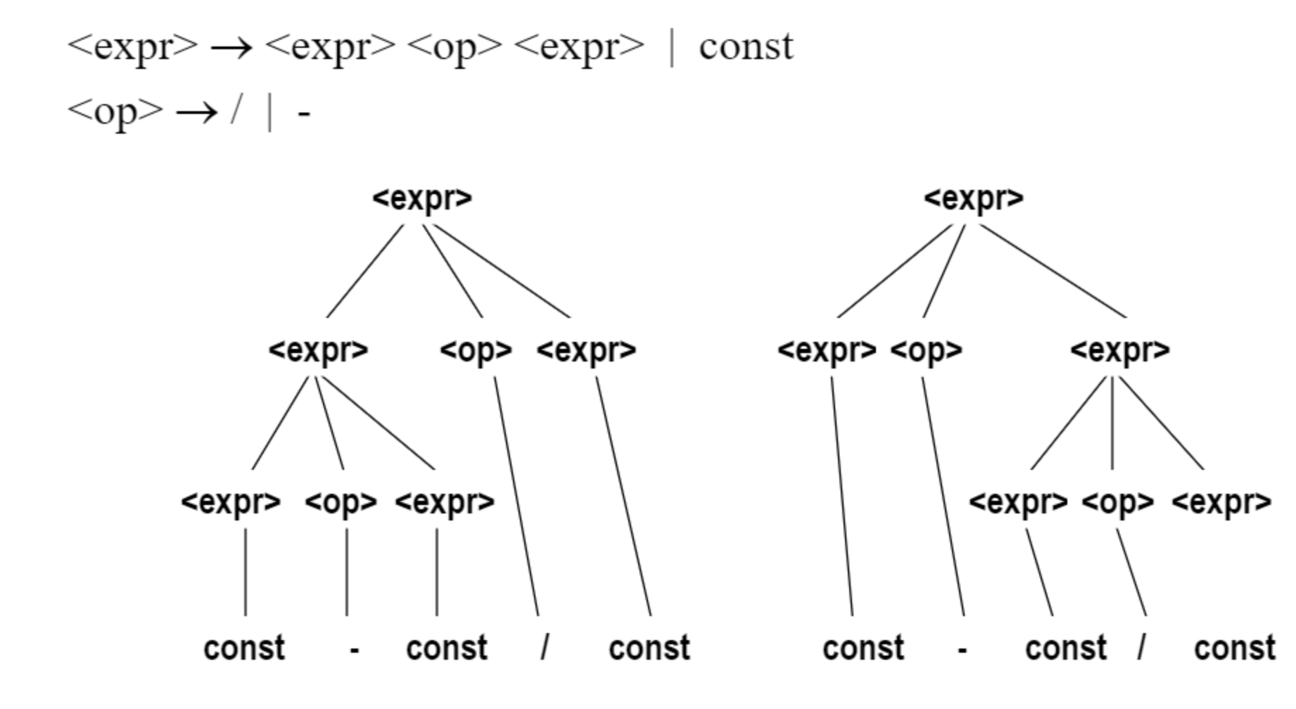 const - const / const 에 대해서 두 가지 parse tree가 만들어 졌다. 연산자의 우선 순위에 의하여 오른쪽 parse tree가 맞지만, 잘못된 BNF로 인해 (const - const) / const 라는 sentence로도 해석될 수 있는 것이다.