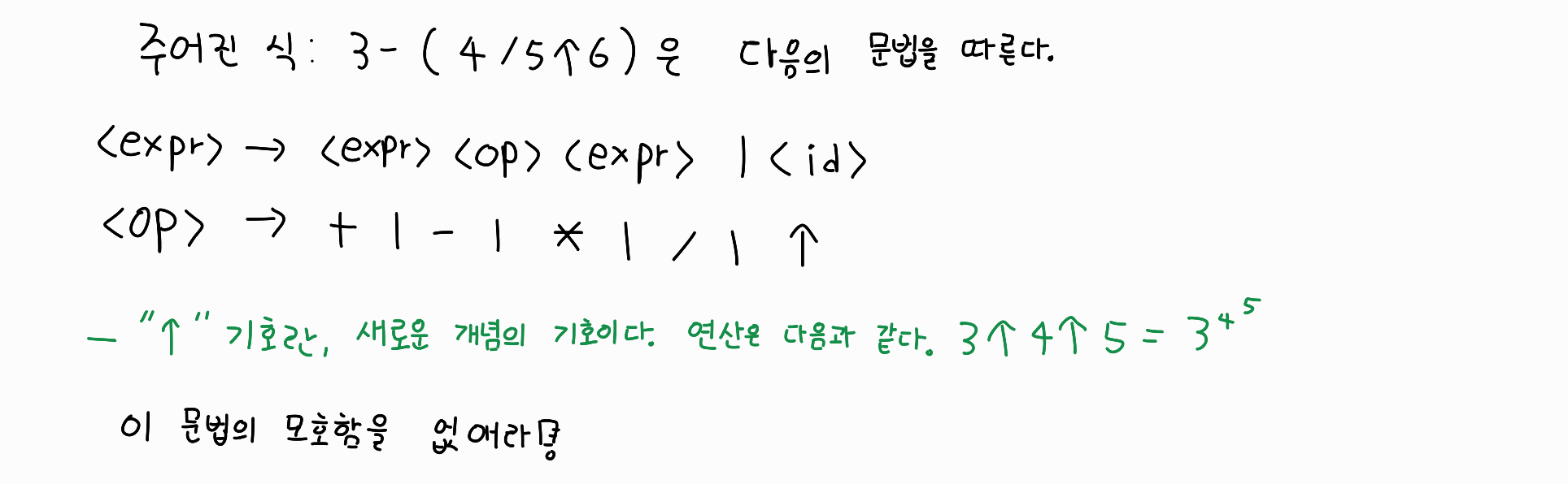 BNF 식만 봐도 이 문법은 모호한 것을 알 수 있다. 우선 순위가 낮은 연산자부터 정의해서 우선 순위가 높은 연산자로 전개한다는 것을 포인트로 스스로의 힘으로 먼저 풀어보길 바란다.