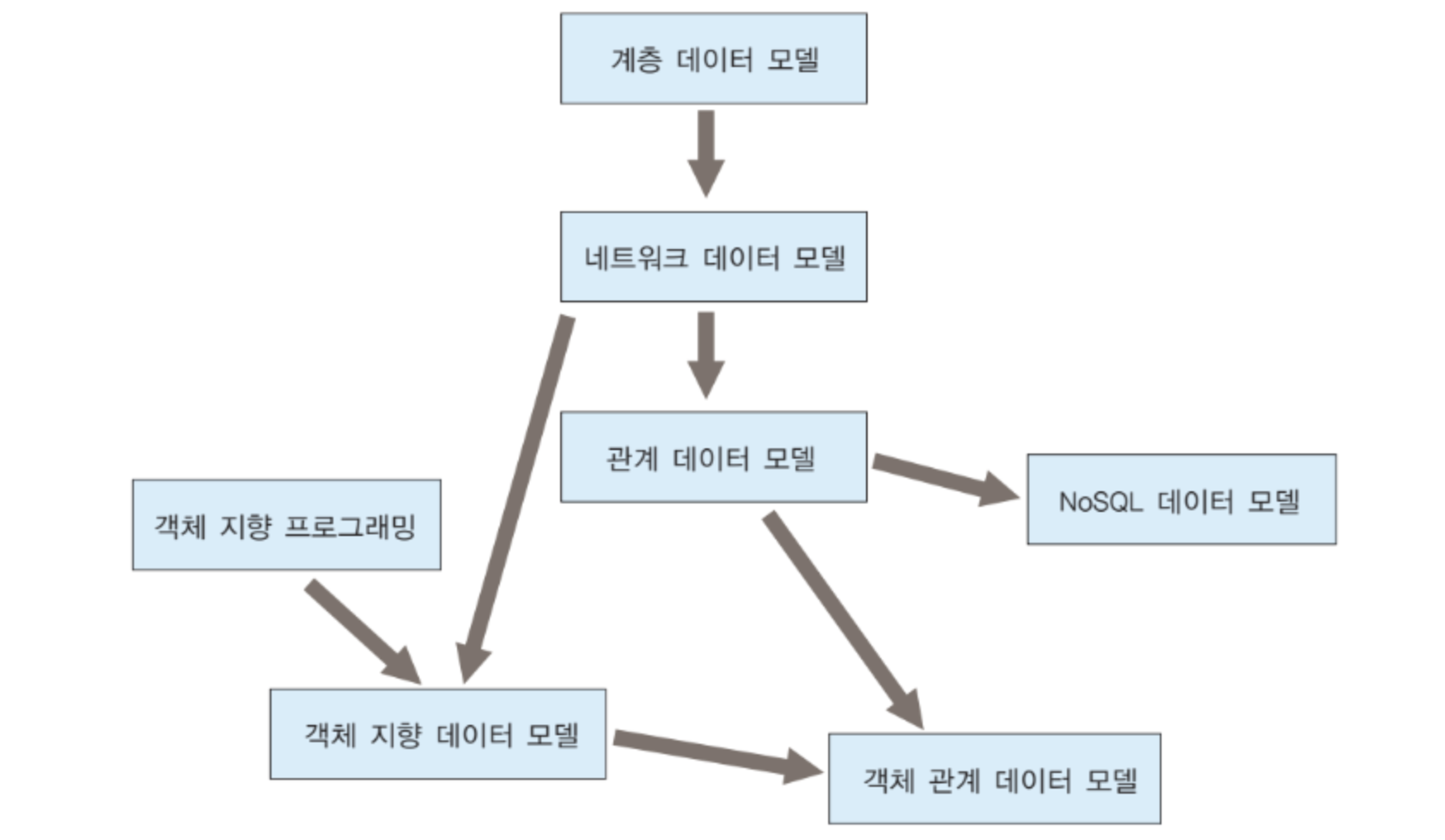 ex) 계층 데이터 모델, 네트워크 데이터 모델, 관계 데이터 모델, 객체 관계 데이터 모델