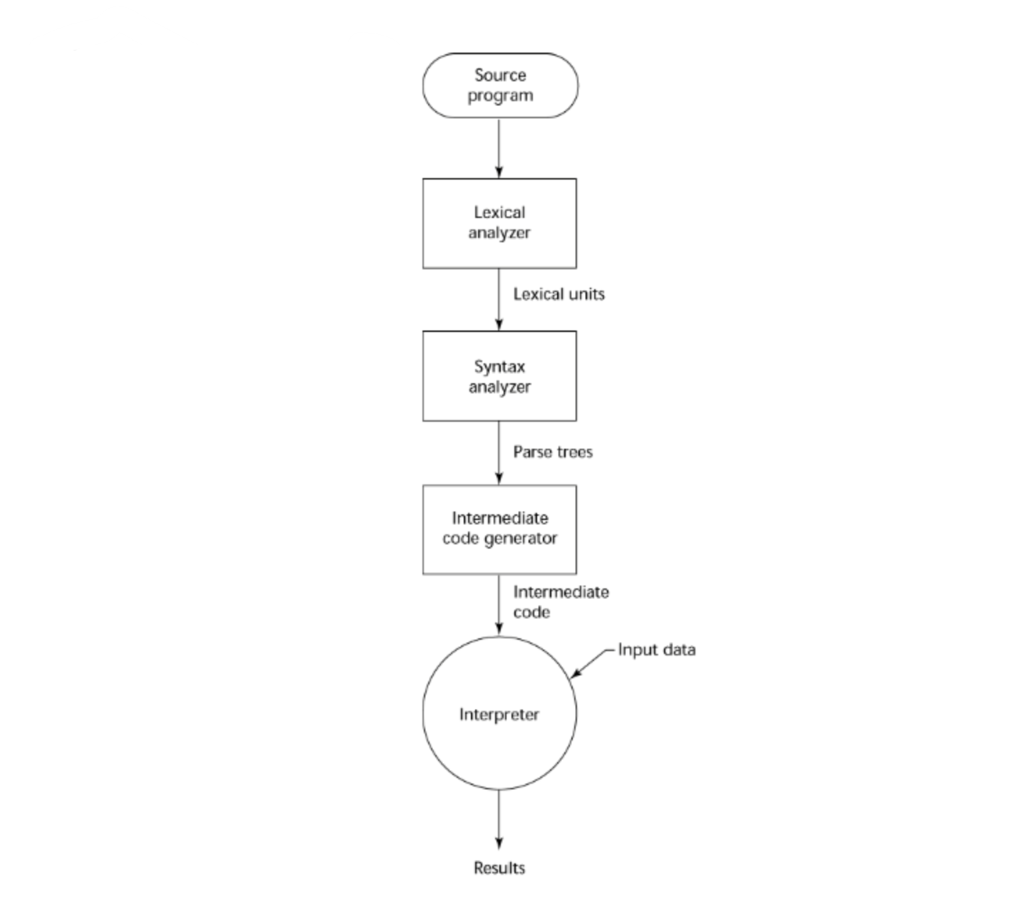 앞선 compilation과 pure interpretation의 흐름도가 절반씩 섞여 있는 것을 확인할 수 있다. 기계어로의 번역이 용이한 중간 단계 언어로 컴파일한 후 이 코드를 interpreter로 번역하는 것이다.