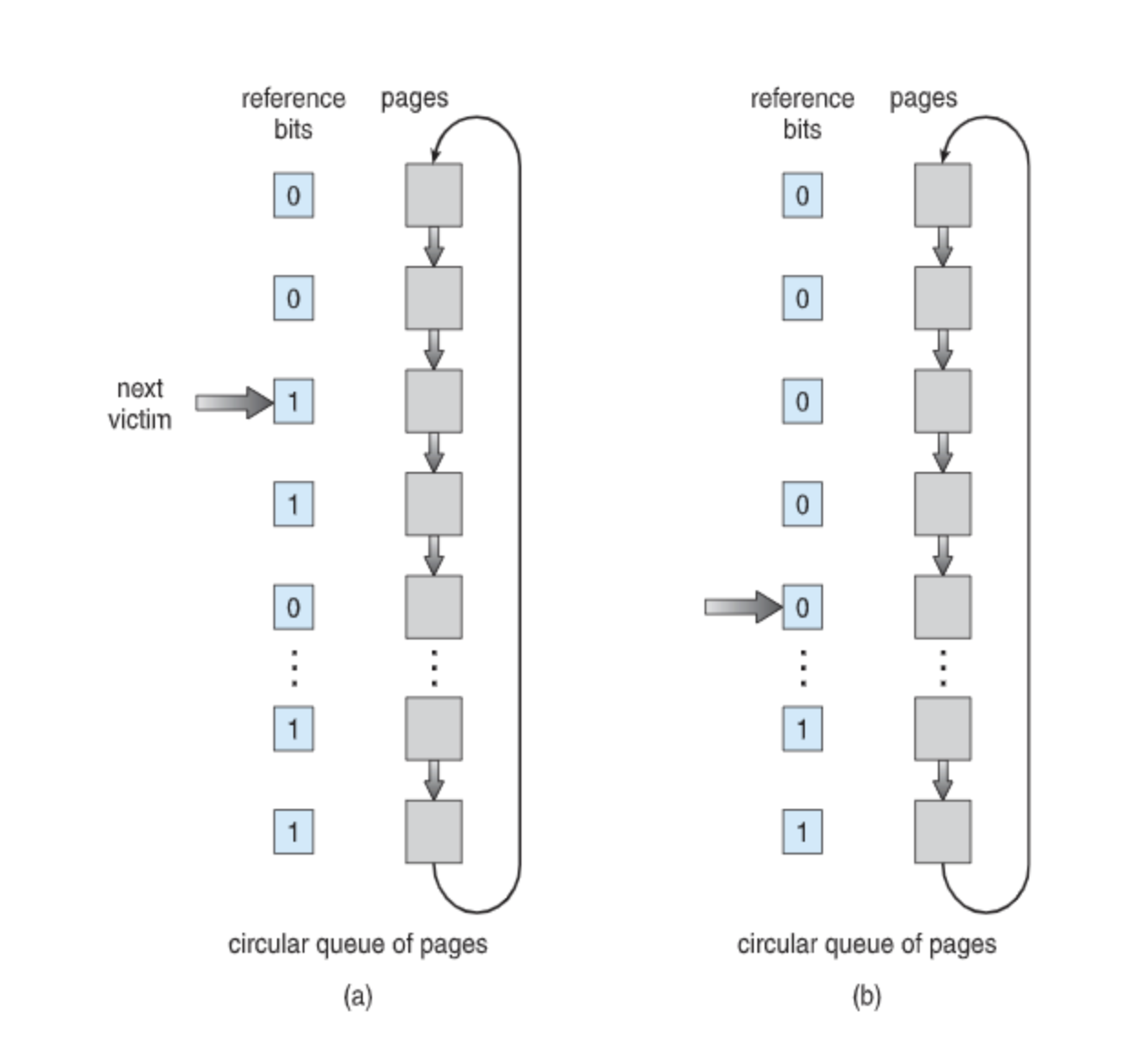 : reference bit는 해당 페이지가 참조될 때, 1로 설정되는 비트이다. 따라서 처음에는 항상 0으로 초기화된다. 따라서 페이지 교체가 필요할 때 reference bit 값이 0인 페이지를 선택할 수 있다.