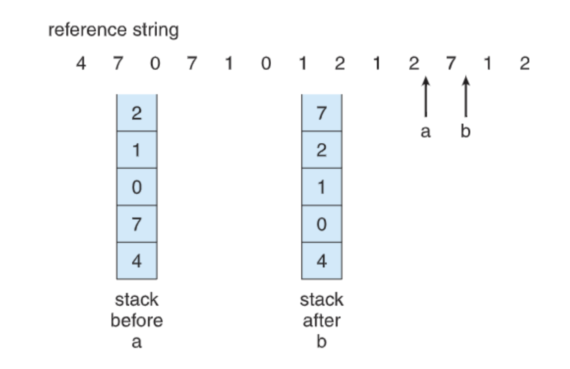 : 페이지를 스택으로 관리하는 것이다. 가장 최근에 참조된 페이지는 스택의 가장 위에 위치하며, 페이지 교체가 필요할 때는 스택의 가장 밑에 있는 페이지를 교체한다. 하지만 스택의 순서를 유지하기 위해 페이지의 순서를 업데이트 하는 비용이 더 많이 들어갈 수도 있다.