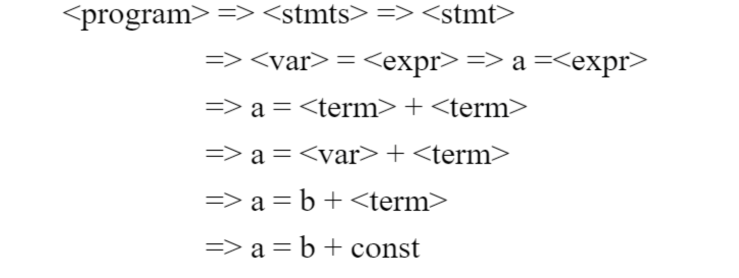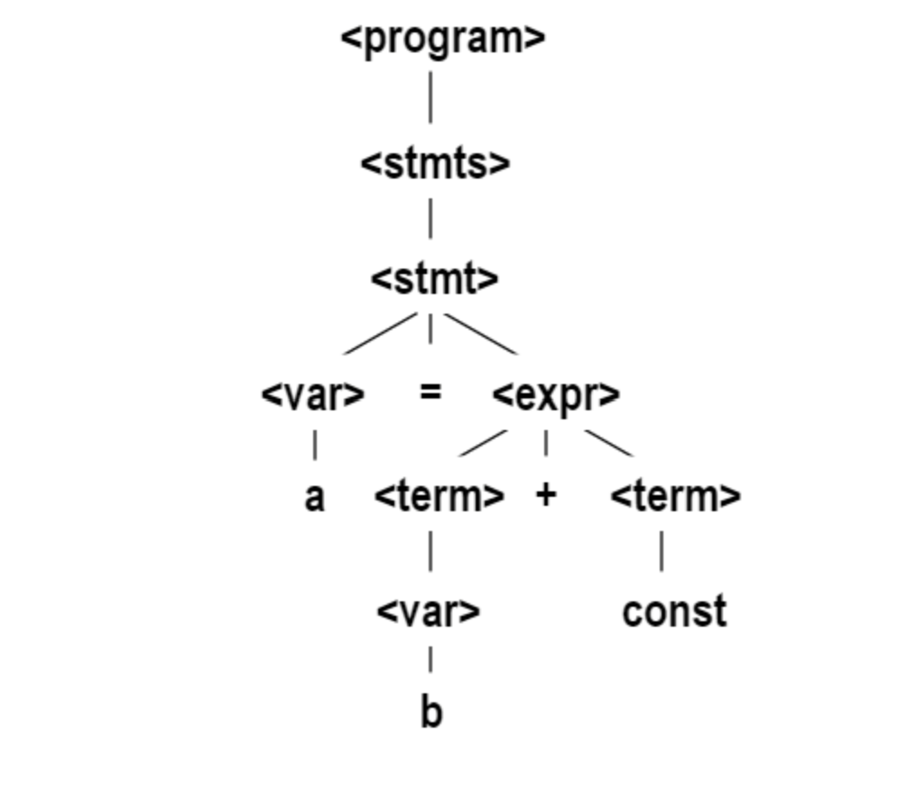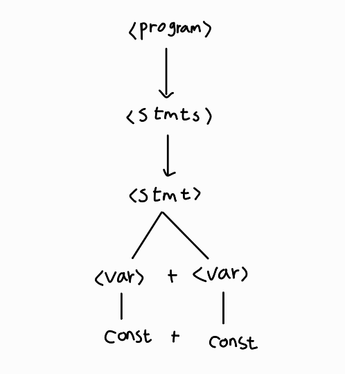 위의 구문을 살펴보면, stmt = var + var이고, var = const라는 것을 알 수 있다. 마지막에 const는 terminal이고, BNF 구문은 이렇게 끝난 것이다.