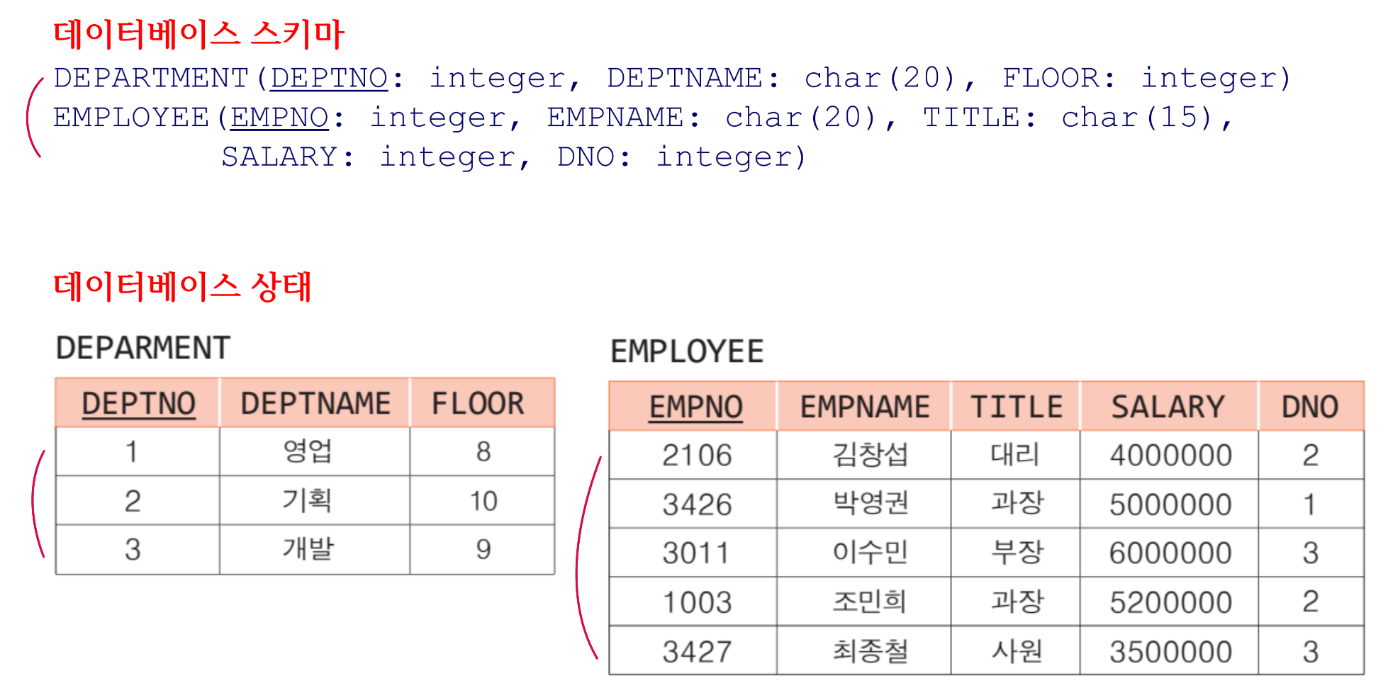 : 전체적인 데이터베이스 구조를 뜻하며 내포(intension) 라고도 부른다. 자주 변경되지 않으며 데이터베이스의 가능한 모든 상태를 미리 정의한다.