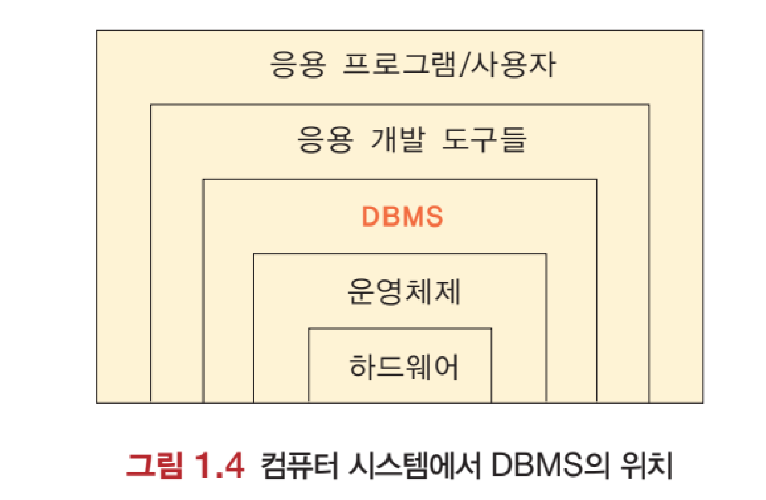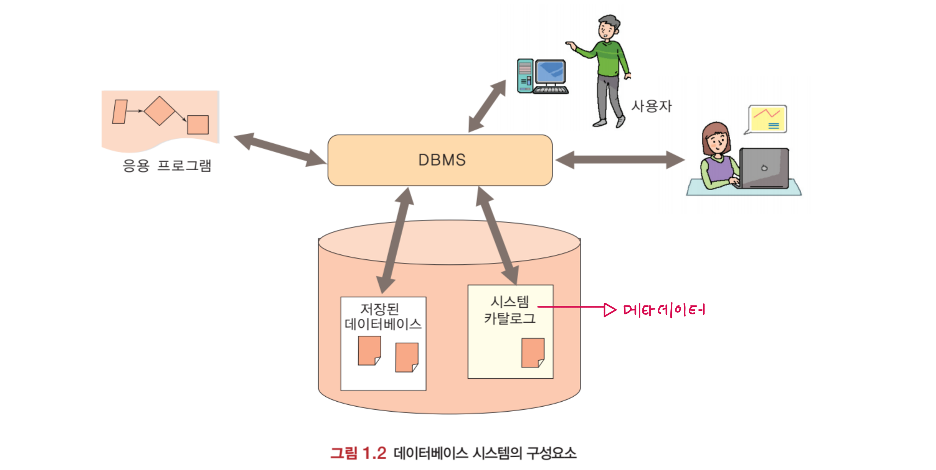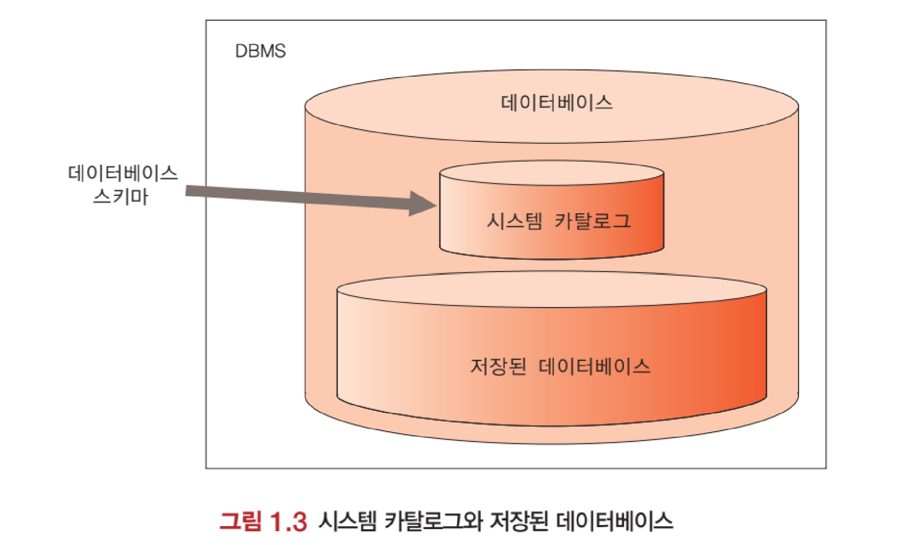 : 그림과 같이 DBMS가 사용자, 프로그램 등의 요청을 받아 데이터베이스에 접근하여 데이터를 관리하고 처리한다. 이때 데이터베이스에는 데이터베이스 외에도 시스템 카탈로그 라는 것이 존재한다. 시스템 카탈로그는 저장된 데이터베이스의 스키마 정보를 유지함으로써 데이터베이스에 대한 메타데이터라고 할 수 있다.