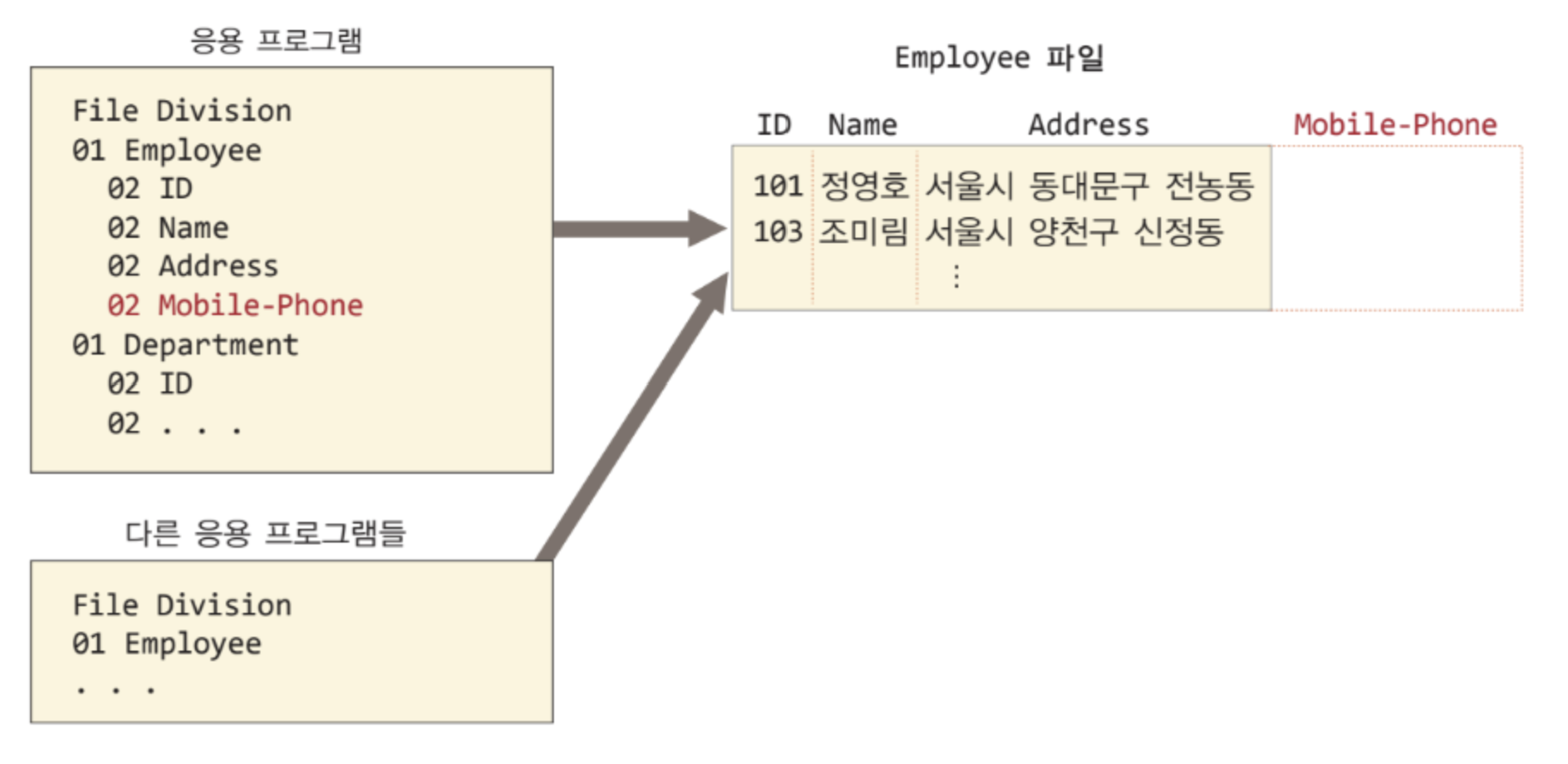 위의 그림을 보면 파일에 새롭게 추가된 Mobile-Phone 필드가 하나의 응용 프로그램에만 추가되었고, 다른 응용 프로그램들에는 적용되지 않았다. 이 경우 다른 응용 프로그램들은 Moblie-Phone에 대한 내용이 없기 때문에 Employee 파일에 접근할 수 없게 된다.