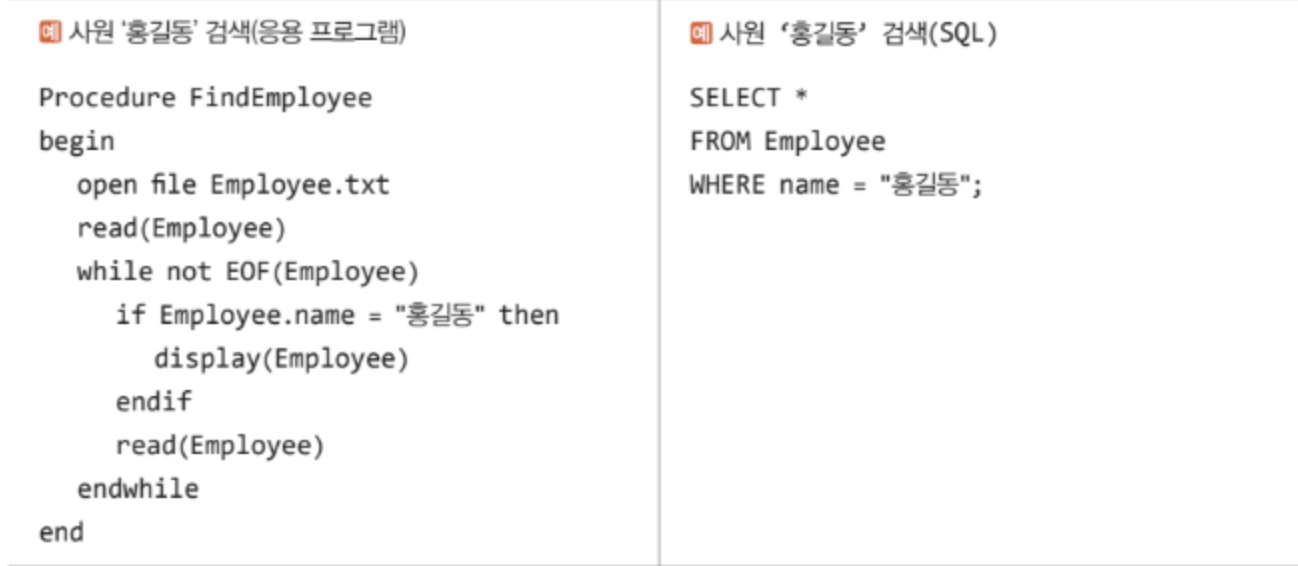 | 데이터에 대한 접근은 미리 작성된 응용 프로그램을 통해서만 가능하다. | 응용 프로그램을 통해서 뿐만 아니라 질의어를 사용하여 데이터에 대한 융통성 있는 접근이 가능하다. |