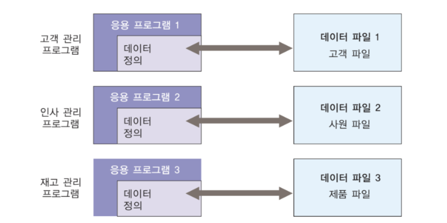 : 파일 시스템은 DBMS가 등장하지 않았을 때인 1960년대부터 사용되어 왔다. 파일은 기본적으로 바이트 스트림 또는 레코드로 구성되어 있는데, 한 레코드는 연관된 필드들의 모임이라고 할 수 있다. 파일에 접근하는 방식이 응용 프로그램에 명시되므로 데이터에 대한 응용 프로그램의 의존도가 높다. 파일이 변경되면 응용 프로그램 또한 같이 변경되어야 하기 때문이다.