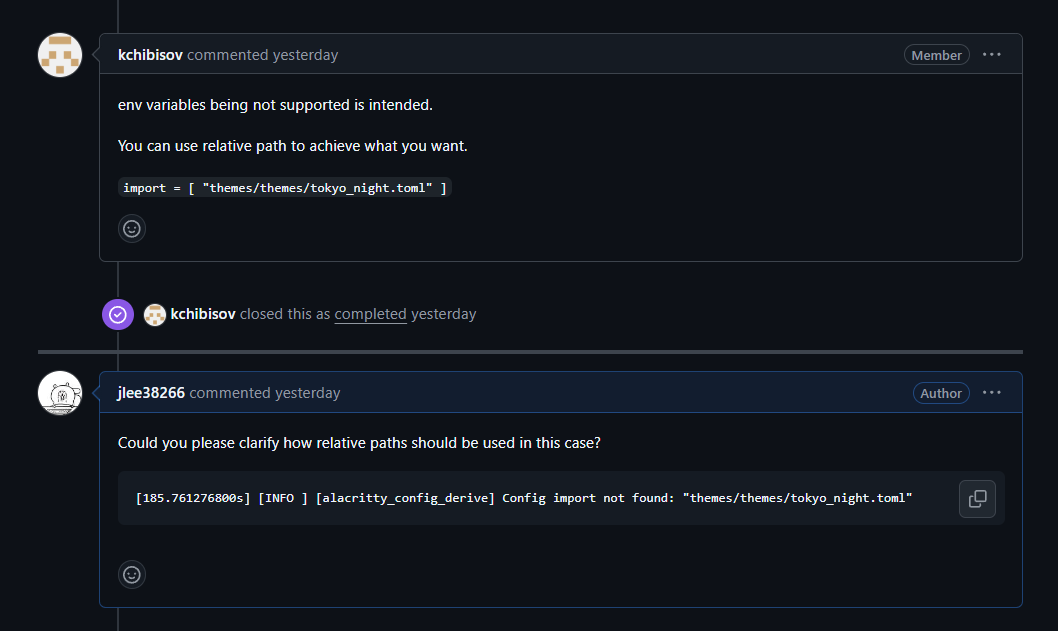 "%APPDATA%/alacritty/themes/themes/tokyo_night.toml" ๊ณผ ๊ฐ์ evn var์ ์๋์ ์ผ๋ก ์ง์ํ์ง ์์ผ๋ฉฐ, relative path๋ก ํ ๋ง๋ฅผ ์ฐ๊ฒฐํ ์ ์์ต๋๋ค. v0.14.0๋ถํฐ ์ง์๋๋ Alacritty ๋ฒ์ ํ์ธ ํ์.