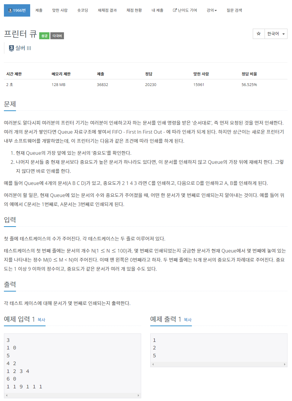- 우선순위 큐와 큐를 사용하여 풀 수 있는 문제이다.