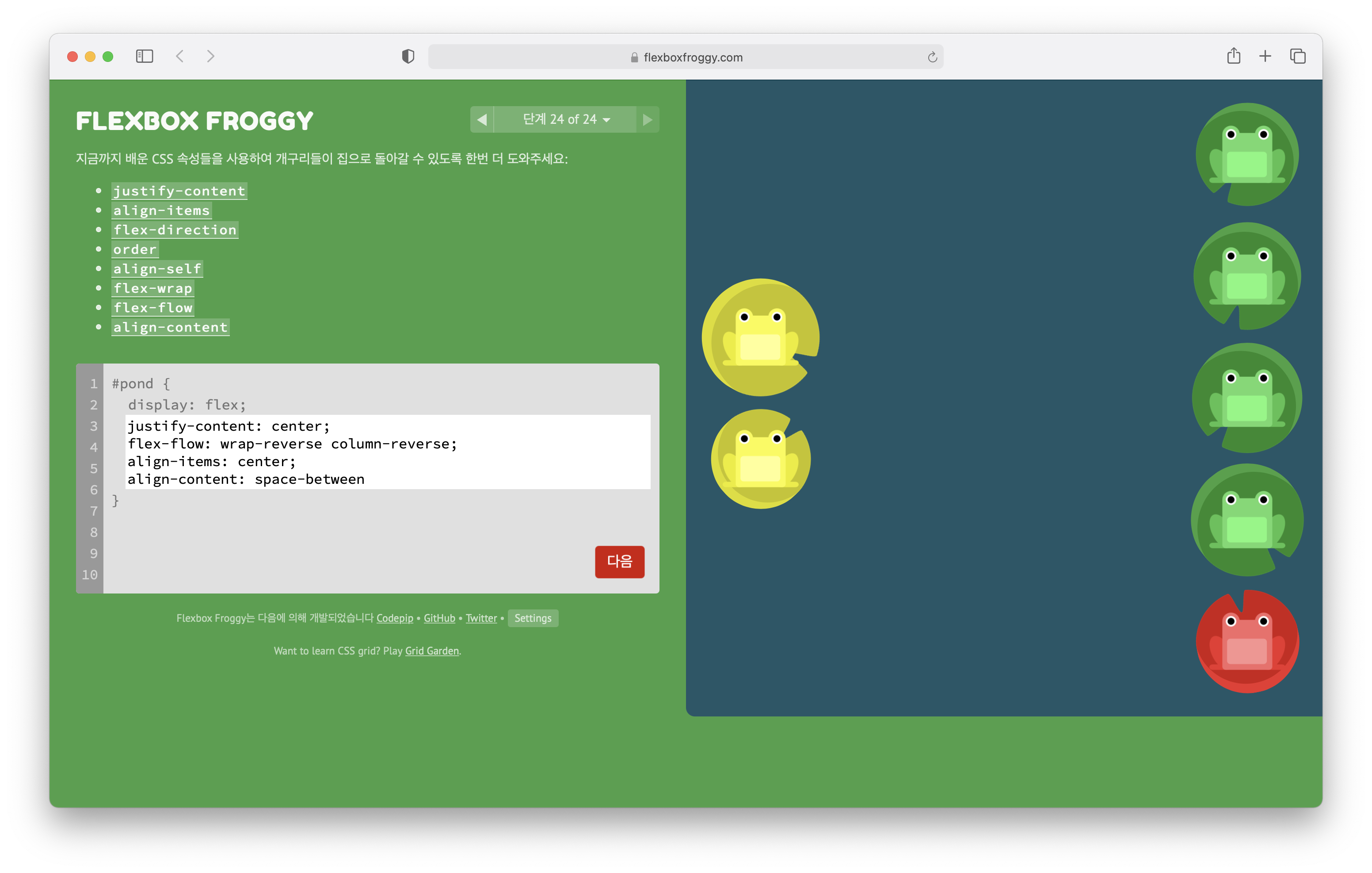 주어진 프로퍼티를 보고 하나씩 맞춰가면서 푸는데 플렉스박스 마지막 문제는 앞 문제들에 비해 난이도가 확 올라서 시간이 좀 걸렸다. 그래도 풀었을 때 그 짜릿함이란...