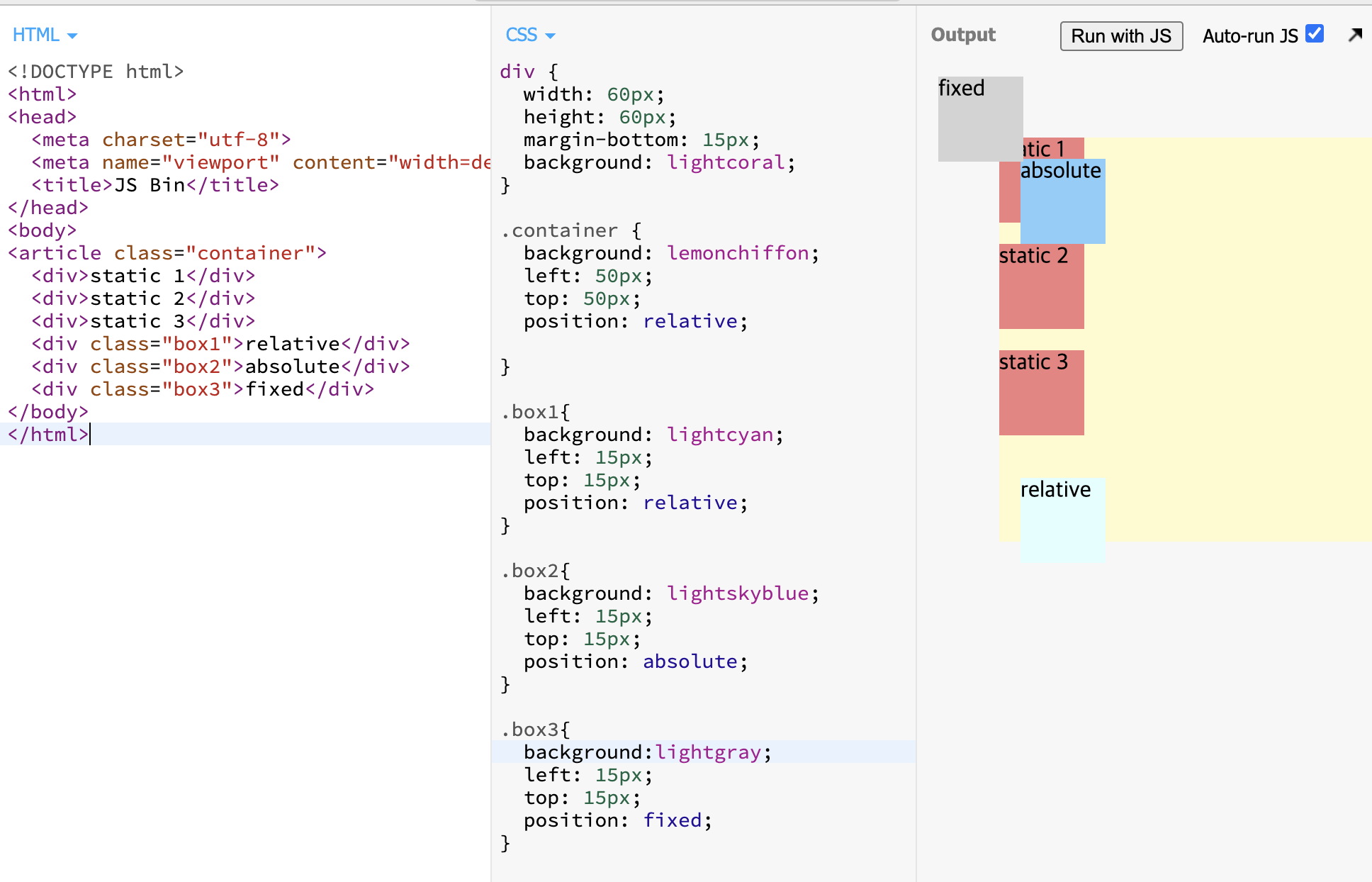 강의를 들으면서도 absolute의 개념이 살짝 헷갈렸었는데 absolute가 static을 제외한 부모 요소를 기준으로 이동한다는 글을 보고 캡쳐된 내용처럼 보기 쉽게 배치해 봤더니 그제서야 이해가 갔다.