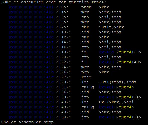 이제 해결조건을 알았으니 disas func4를 통해 func4의 코드를 본다.
