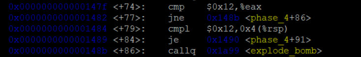 그 후 func4가 실행되는데 func4의 코드를 보기 전에 phase_4가 끝나는 조건을 아래에서 먼저 찾는다. <+74>를 봤을 때 func4이 끝나고 return된 eax의 값을 18과 비교를 한다. eax != 18이라면 explode_bomb이 실행되므로 func4를 실행하고 나올때의 값이 18이 되어야 phase_4가 해결됨을 알 수 있다.