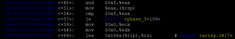 입력받은 값을 eax 레지스터에 이동시키고, 0xf와 and연산을 시키는데 이때의 값과 0xf와 같다면, 즉 가장 뒤 바이트가 0xf면 폭탄이 터지게 된다. 터지지 않았다면 ecx, edx에 0을 저장하고, rip에 있는 주소를 rsi에 저장하는 것을 볼 수 있다. 이 주소값은 <array.3417>이 저장되어있는 주소고, 이름에서 보이다시피 배열인 것 같아 x/32d로 확인을 하게 되었다.