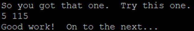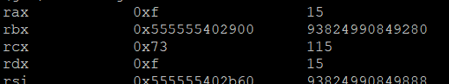 이 과정은 첫 번째 입력을 1부터 차례로 1씩 증가시켜 입력하고, 두 번째 입력은 아무 숫자나 입력해서 실행때마다 info register를 통해 register의 값을 확인했다. 첫 번째 입력숫자가 5일 때 rax와 rdx모두 15가 나왔다. 이 때의 rcx가 115였으므로 5 115가 정답이 된다.