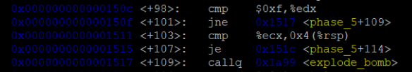 <+98>에서 edx와 15를 비교해 다르면 폭탄이 터지는 jump분기가 있다.
