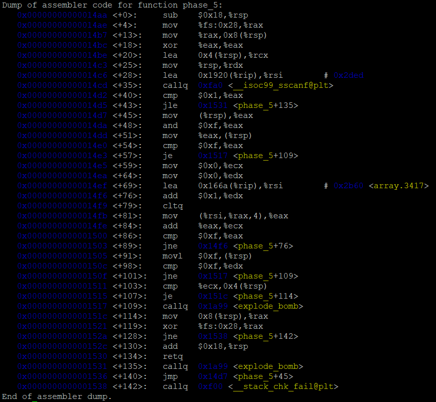 edx에 저장된 값을 1 증가시킨 다음 cltq를 실행해 eax의 부호를 확장해 rax에 저장한다. 그 다음 배열의 시작주소 rsi에서 rax*4만큼 즉, array[%rax]에 있는 값을 eax에 저장하고, 0xf와 비교해 같지 않으면 <+76>으로 돌아간다. 즉 코드가 종료되기 위해서는 다음코드로 진행해야하므로 array[%rax] == 0xf == 15이어야 한다. x/32d로 배열을 확인했을 때 15의 값을 저장하고 있는 index는 6이다. 그래서 첫 번째 값을 6이라고 예측 후 계속 코드 진행해본다.
