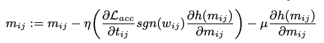 직접적으로 gradient 업데이트를 적용하는 것 대신, 저자들은 가중치들의 강도(1), 가중치의 변화(2), BNN gradient의 방향 을 일정하게 하기 위해서 보조 파라미터에 대해 개선된 update 규칙(m_{ij})을 제시한다.