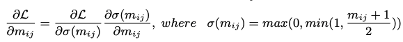 이전 연구들에서 binary weight들은 계단 함수와 시그모이드 STE를 사용하여 표현되어 왔지만, indicator function인 h{ij}와 학습가능한 파라미터인 m{ij}를 위해서 저자들은 간단한 계단 함수를 사용한다고 한다.