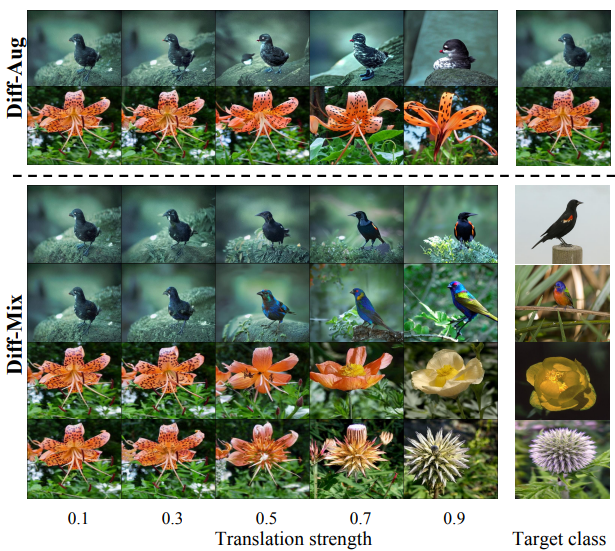 Diff-Mix는 Diff-Aug와 같은 방식을 사용하지만, reference 이미지가 intra-class dataset에서 sampling되는 것이 아니라 full-training set에서 sampling된다는 차이가 있다.