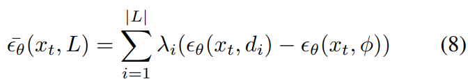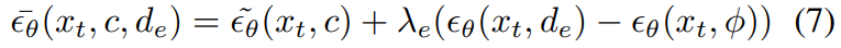 ϵθ(xt, c) − ϵθ(xt, ϕ)는 condition c로 인해 인코딩된 semantic 정보를 인코딩하는 것으로 미루어 보았을 때, ϵθ(xt, de) − ϵθ(xt, ϕ) 식을 추가하여서 각 timestep에 노이즈를 전개하는 방식을 채택한다.