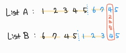 List A는 [1,2,3,4,5], List B는 [6,7,4,5]일 때 교차점은 4이다. 리스트가 끝나는 지점에서 다른 리스트를 이어붙이면 교차점 이전의 부분은 상쇄가 된다.