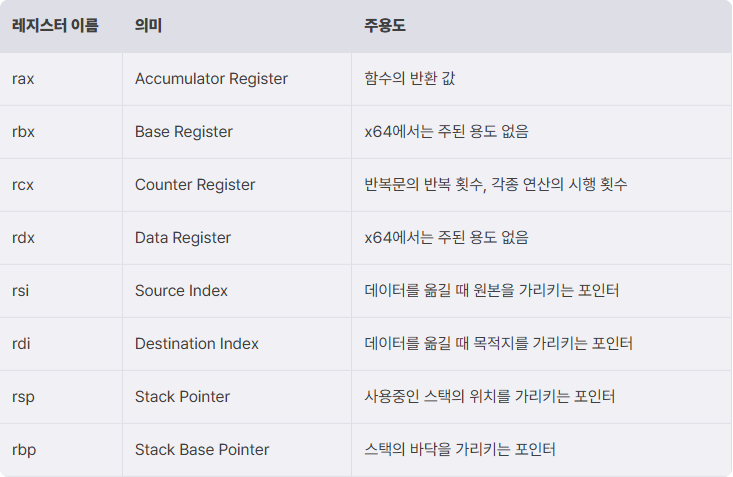 레지스터는 CPU가 데이터를 빠르게 저장하고 사용할 때 이용하는 보관소, x64 아키텍처에는 범용 레지스터(General Register), 세그먼트 레지스터(Segment Register), 명령어 포인트 레지스터(Instruction Point Register, IP), 플래그 레지스터(Flag Register)가 존재