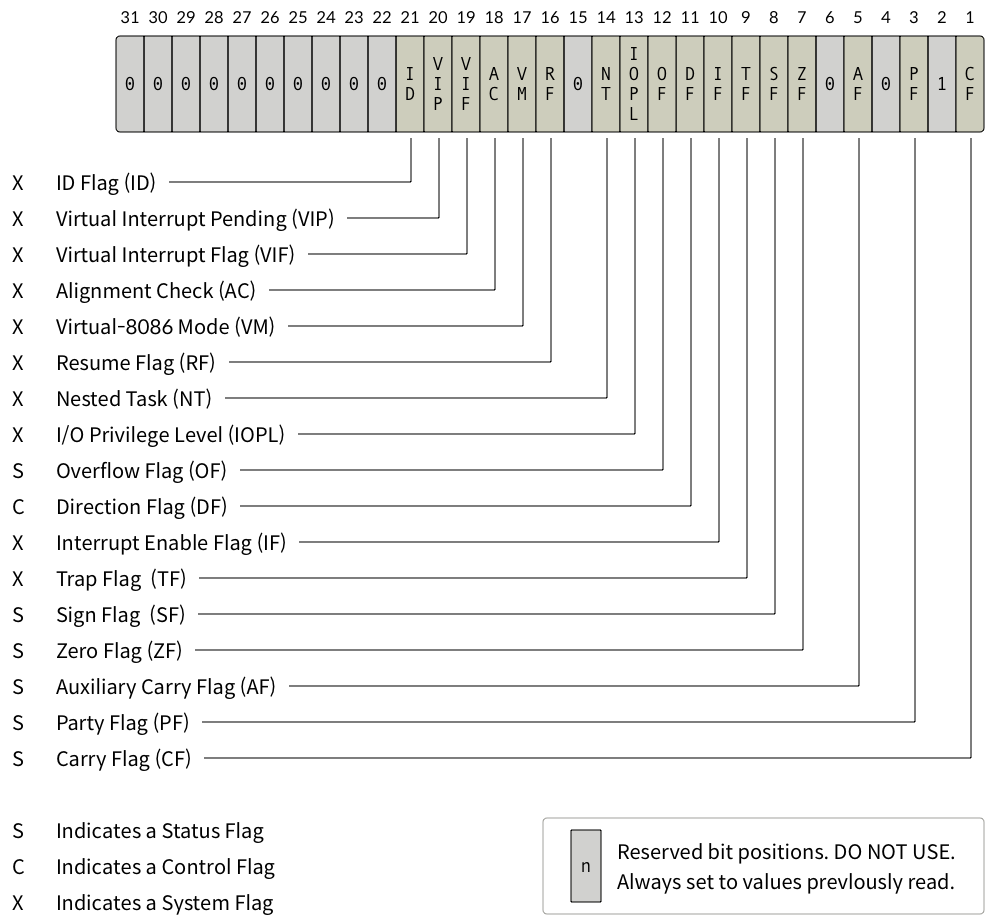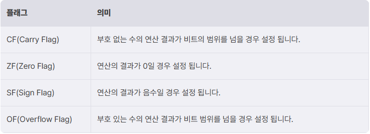 CPU가 연산을 수행한 후 결과의 상태를 저장하는 특수한 레지스터, 특정 연산 후 조건을 판단하는데 사용(분기, 인터럽트), x64아키텍처에는 RFLAGS(8byte)가 존재