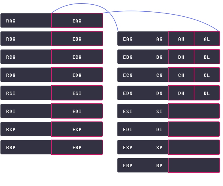 IA-16 또한 16비트 크기를 가지고, IA-32도 IA-16과의 호환을 우해 ax, bx, cx, dx, du, su, bp, sp는 eax, ebx, ecx, edx, edi, esi, ebp, esp의 하위 16비트를 의미, 이를 또 상위, 하위 8비트로 나눌수 있고 등등 아래 그림에서 확인 가능