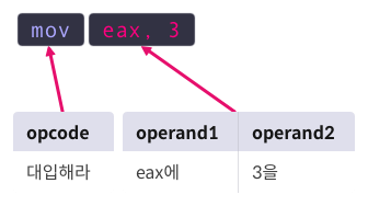 문장의 동사에 해당하는 명령어(Operation Code, Opcode)와 목적어에 해당하는 피연산자(Operand)로 구성, 피연산자는 연산의 입력 값(레지스터, 상수, 메모리 주소)