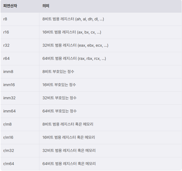 []로 둘러 싸인 것으로 표현, 앞에 크기 지정자가 올 수 있음mov [rdi], eax ; (X) 오류 발생 가능: 크기 지정이 명확하지 않음