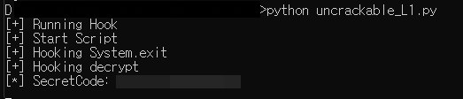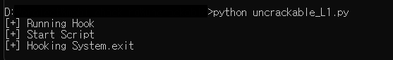 전체 스크립트는 다음과 같다. 단말기에서 uncrackable을 실행하고, 해당 파이썬 스크립트를 cmd에서 실행한다.