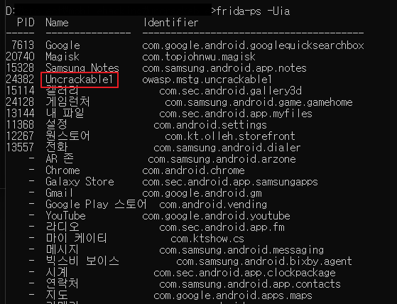 frida.ProcessNotFoundError: unable to find process with name 'owasp.mstg.uncrackable1'해당 에러는 패키지 이름 대신 프로세스 이름을 사용하니 정상적으로 실행됐다.