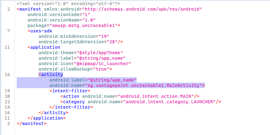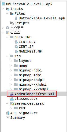 MainActivity는 왼쪽 탭 소스코드➡️sg.vantagepoint 패키지➡️uncrackable1 패키지에 존재한다.